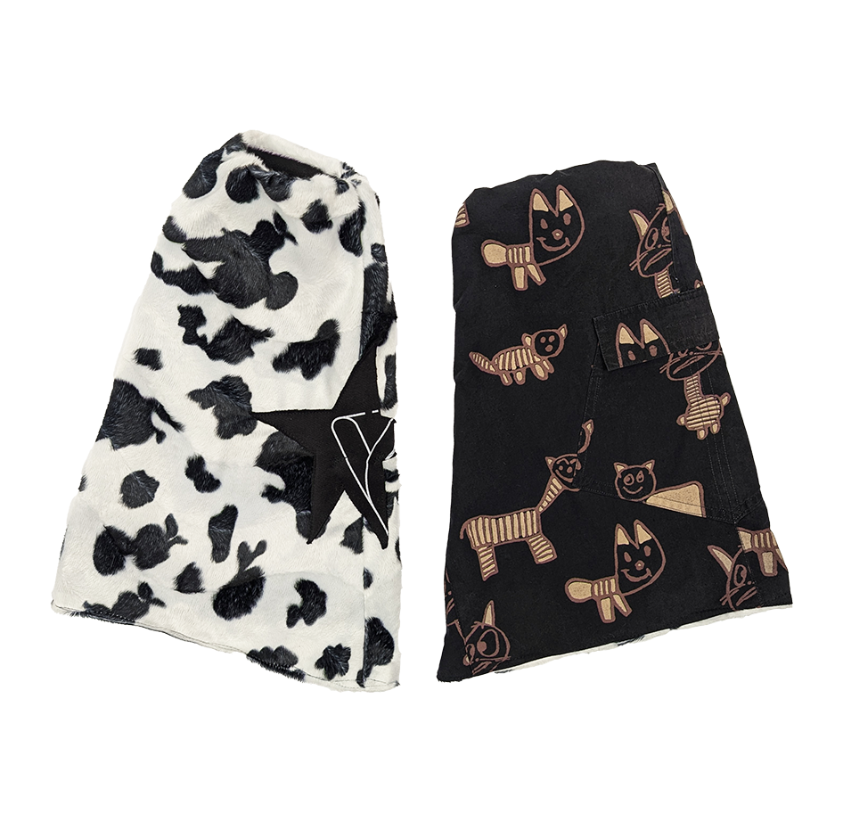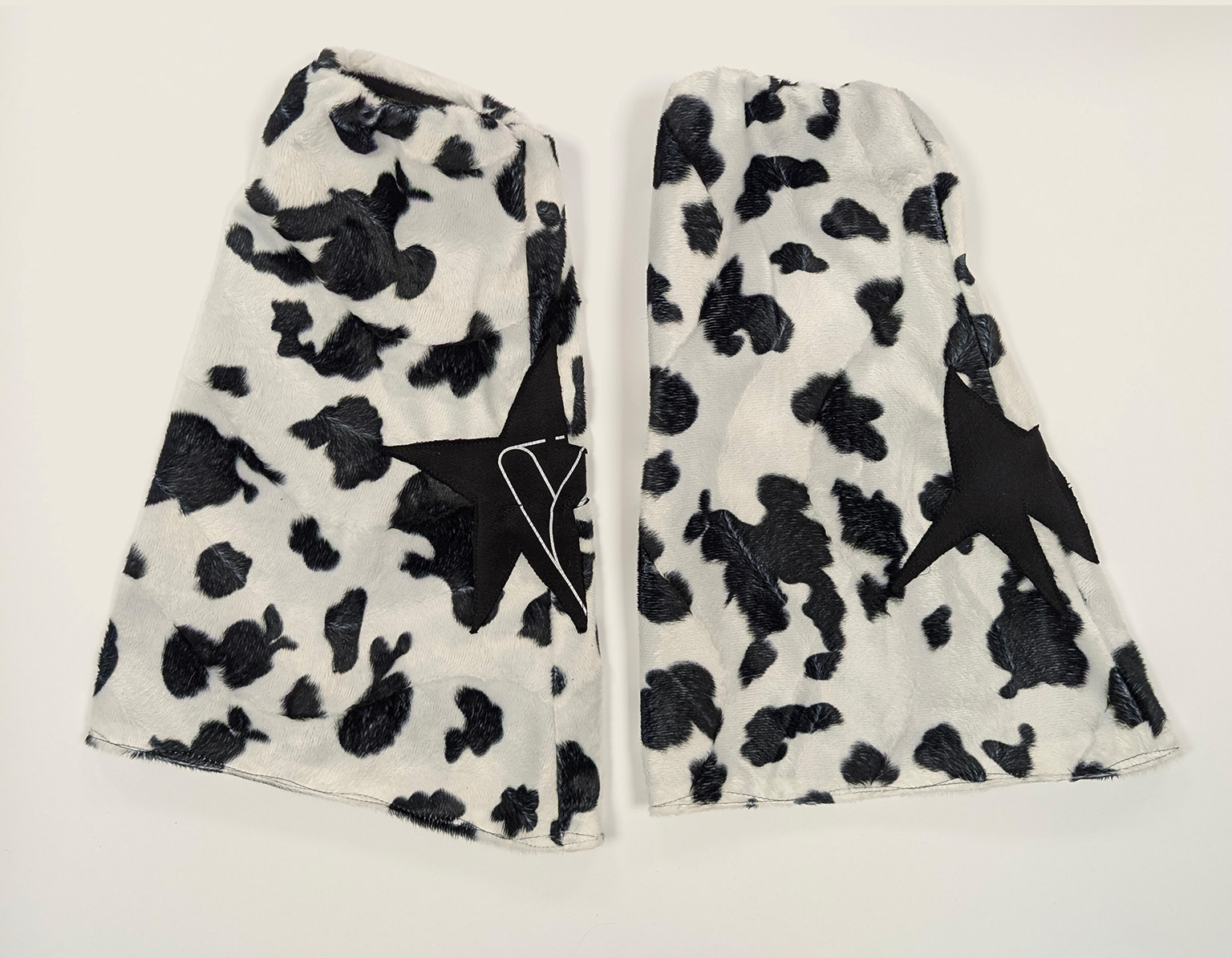 FURRY COW/COTTON FABRIC WITH DRAWINGS + ONE LEG HAS A POCKET