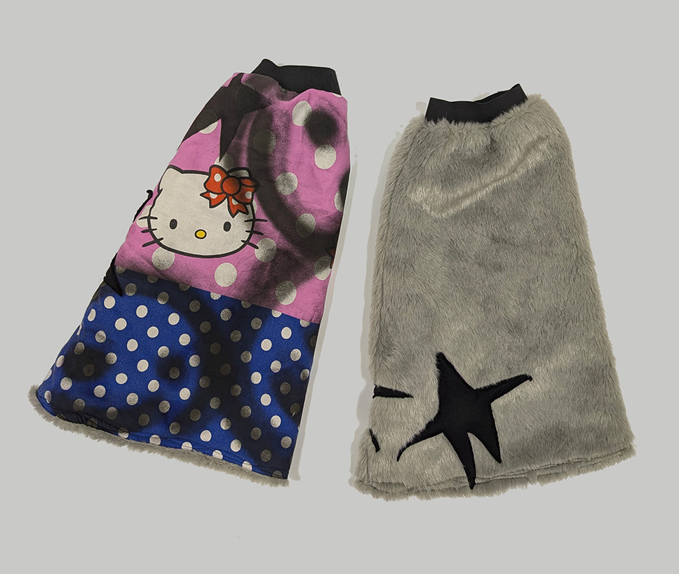 REVERSIBLE LEG WARMERS MADE FROM UPCYCLED FABRICS.